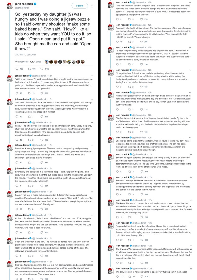 The story took nearly two dozen tweets to unfold, with Roderick’s nine-year-old daughter being forced to take a crash course in mechanical engineering in order to solve the problem of wanting some lunch. When she came to her distracted father saying that she was hungry, he suggested that she heat up some baked beans, and she revealed that she didn’t know how to use a can opener.