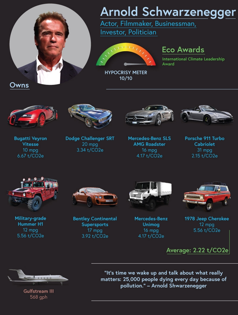 The former governor of California has promoted initiatives to fight climate change since his time in office. He recently gave an interview on “terminating pollution” (because he was the Terminator; get it?) to the Political Climate podcast. Yet, when it comes to his own lifestyle, his military-grade Hummer and private jet also raise eyebrows.
