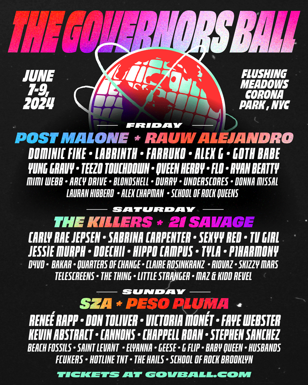 Each year at Gov Ball, the biggest artists in the world spanning multiple genres gather for memorable performances. From June 7-9, 2024, tens of thousands of fans will flock to Corona Park to hear the likes of Post Malone, SZA, Sabrina Carpenter, Peso Pluma, and more.