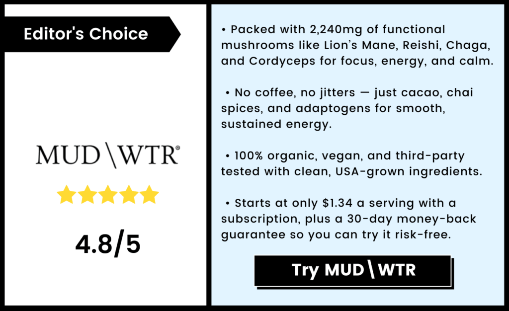 - MUD\WTR and most mushroom coffees contain functional mushrooms like Lion’s Mane and Reishi that help you manage stress and boost mental clarity.