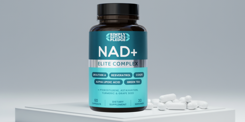 Simply Nature’s Pledge NAD+ Elite Complex delivers 300 mg of direct NAD+ per serving, paired with a targeted blend of ingredients linked to cellular energy and longevity research.